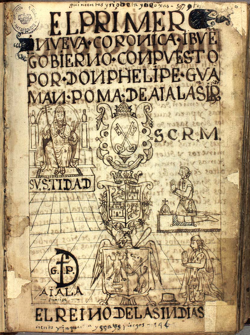 Title page of El primer nueva corónica y buen gobierno (“the first new chronicle and good government”), by Felipe Guamán Poma de Ayala (1615?). Image from Wikimedia Commons.